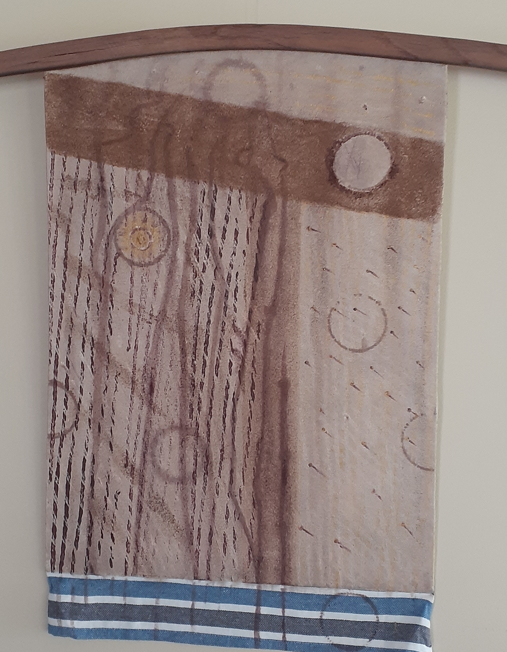 Party balloons & Wine time: Shiraz-gesso on tea towel Shiraz reducktion and sawdust froma French oak wine barrel, top framed with timber from a wine barrel